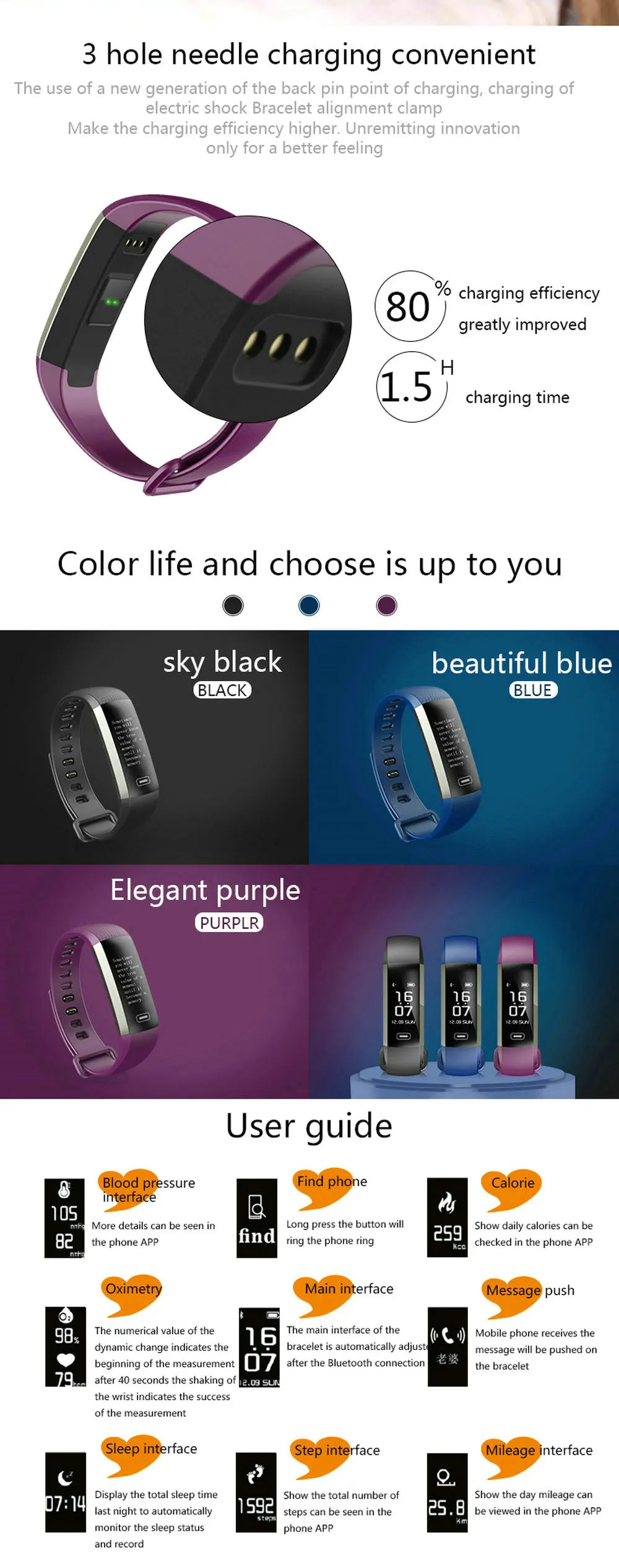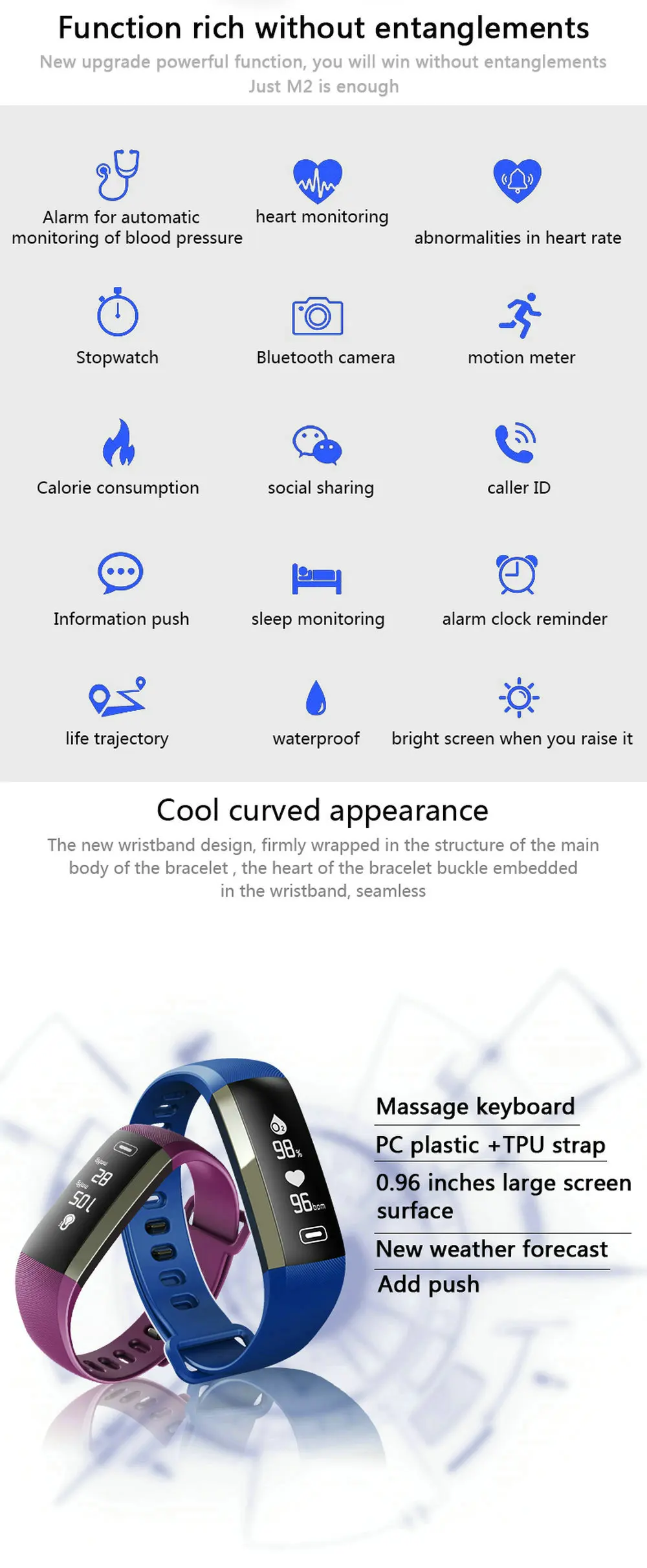 Function:Message Reminder,Blood Pressure,Call Reminder,Passometer,Calendar,Alarm Clock,Heart Rate Tracker