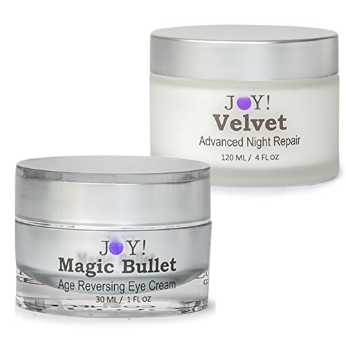 Magic Bullet is a powerful retinol cream that is designed to reverse signs of aging in the delicate skin around the eyes. JOY! Products include a proprietary blend of oils and extracts including Vitamin A, B-5, K & E , Jojoba Oil, Grape Seed Extract, & Pacific Sea Kelp. Magic Bullet targets different signs of skin aging around the eyes, including wrinkles, puffiness, crow's feet, dark circles and sensitivity of the skin due to dryness. Advanced, microencapsulated Cosmeceutical ingredients helps smooth away the signs of skin aging around the eyes. Microencapsulation technology optimizes Vitamin K Potency and absorption to help reduce the appearance of fine lines. Microencapsulated Niacinamide and Ash Tree Bark Extract maintain hydration and reduce visible dark circles. A powerful Age Reversal Firming Complex works synergistically with antioxidant Vitamin C, powerful peptides and botanical extracts to fortify and smooth skin. Formulated without artificial fragrances, colors or parabens. This product contains a form of Vitamin A. If you are pregnant or breastfeeding, please consult a physician prior to use. Not recommended for use within 72 hours of waxing or exfoliation. Avoid contact with eyes. Velvet will replenish and restore your skin while you sleep. Contains medical antioxidants and hydrating ingredients. Include a proprietary blend of oils and extracts including Vitamin A, B-5, K & E , Jojoba Oil, Grape Seed Extract, & Pacific Sea Kelp. Thanks to potent antioxidants and vitamins, the formula protects the cell membranes from free radical damage too....Velvet Advanced Night Repair works best at night when the skin's cellular renewal process is the most active. This moisturizing night cream restores luminosity while reducing the appearance of fine dehydration lines for a more youthful-looking appearance. Wake up looking rested and refreshed. This unique wrinkle repair nighFeature