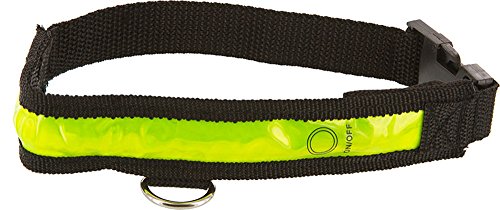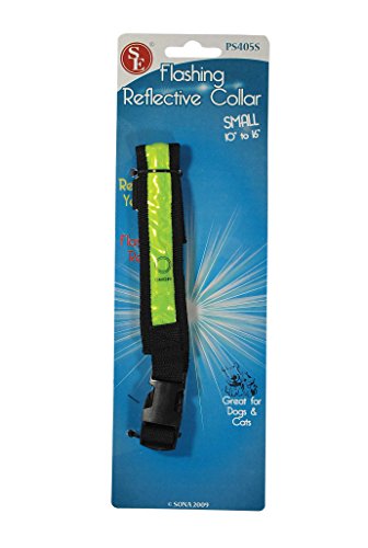 Studio : SE Publisher : SE Binding : Misc. Product Description Illuminated Dog Collar -Size: Small(12 in.x16 in.) -Visible from up to one mile at night, in low-light and no-light situations -Lightweight, weather resistant. -Longer battery life in flashing mode. -Red illumination with Yellow Reflective Material. -Requires 1 3V-CR2032 Battery (Batteries Included) -Safe; shockproof. 0