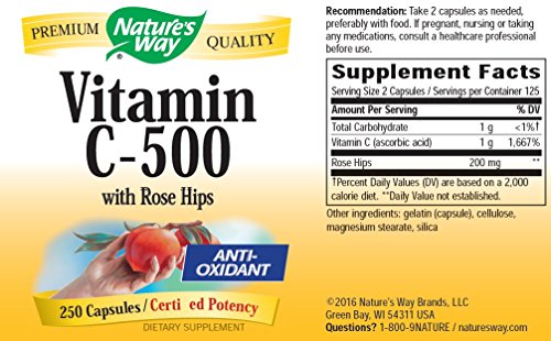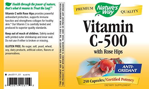 -. Binding : Health and Beauty -. Brand : Nature's Way -. Department : Health and Beauty>Health and Wellness -. EAN : 0033674403112 -. Feature : Nature's Way -. IsAdultProduct : 0 -. IsAutographed : 0 -. IsMemorabilia : 0 -. Label : Nature's Way -. LegalDisclaimer : * These statements have not been evaluated by the Food and Drug Administration. This product is not intended to diagnose, treat, cure or prevent any disease. ** Always refer to the manufacturer's label on the product for description, recommended dose and precautions. -. Manufacturer : Nature's Way -. Model : 40311 -. MPN : 40311 -. NumberOfItems : 1 -. PackageQuantity : 1 -. PartNumber : 40311 -. ProductGroup : Health and Beauty -. ProductTypeName : HEALTH_PERSONAL_CARE -. Publisher : Nature's Way -. ReleaseDate : 2010-05-13 -. Size : 250 -. Studio : Nature's Way -. Title : Nature's Way Vitamin C 500 with Rose Hips, 250 Capsules -. UPC : 336744031124