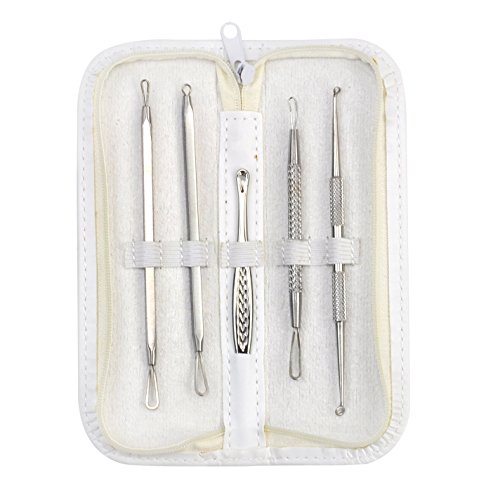 5 Piece Premium Stainless Steel Blackhead, Blemish and Comedone Remover Tool Kit with White Leather Case