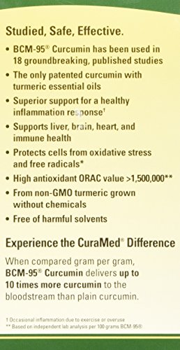 CuraMed is the most clinically studied, enhanced absorption curcumin on the market, with 25 published studies demonstrating support for joints, mood, mental health, and pain relief.† CuraMed contains BCM-95 Curcumin, a patented blend of standardized curcumin with turmeric essential oils that provides greatly enhanced absorption over plain curcumin and sustained retention times at meaningful levels in the body. CuraMed is far superior to turmeric products. Typically, turmeric contains only 2-5% of poorly absorbed curcumin. It takes as many as 500 (500 mg) capsules of turmeric to equal one 750 mg softgel of CuraMed. HEALTHY INFLAMMATION RESPONSE†† BRAIN AND COGNITIVE HEALTH -CARDIOVASCULAR ANTIOXIDANT DEFENSE The curcumin in CuraMed is grown without the use of pesticides or chemicals. The crops are sustainably tended by independent, local farmers who are paid reasonable and competitive prices. Raw materials are consistently analyzed for contaminants and tested for potency. †Occasional muscle pain due to exercise or overuse ††Occasional inflammation due to exercise or overuseFeature