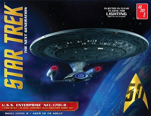 Studio : Round 2 Publisher : Round 2 Binding : Toy Product Description AMT 955 Star Trek The Next Generation U.S.S. Enterprise NCC-1701-D. 1:1400 Scale Plastic Model Kit. Requires Assembly. Skill Level 2. Ages 10 and Up. Plastic Assembly Glue-Together Model Kit. Injected in Clear Plastic For Lighting (Light Kit NOT Included). Features Removable Saucer Section. Over 18 Inches Long. Dome Base with Ball Jointed Metal Rod Included. All Pennant, Registry, Marking, and Life Boat Decals Included. Detachable Captain's Yacht. Battle Bridge. Molded in Clear Plastic. Produced in 2016. Glue and Paint Needed for Assembly - NOT INCLUDED. 0