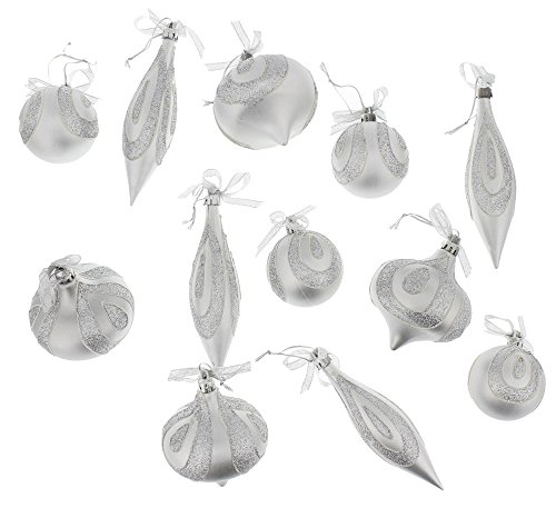 Christmas Holiday Silver Glitter Elegant Onion & Spherical Shaped Ornaments with Bows, Assorted Shapes, 12 Pack, Medium, 2.5"- 6"