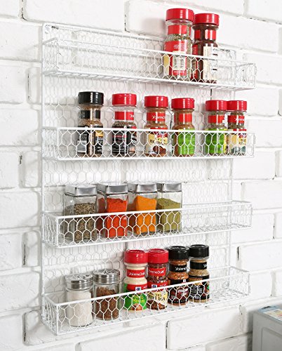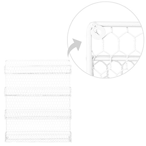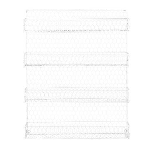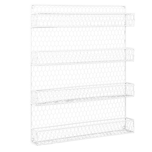Studio : MyGift Publisher : MyGift Product Description Organize your favorite spices and have them conveniently close at hand with this 4 tier wire wall mounted storage rack. The rack is made of metal chicken wire with a casual design to give a little bit of country chic. Easy to install by simply mounting to your cabinet, pantry door or to a wall, each shelf accommodates most standard spice jars. Can also be used to store other items. Spice jars are not included. Official MyGift® product. Approximate Dimensions: 17" W X 20.75" H X 2.25" D. 0