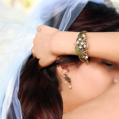A sculptured bracket of art nouveau style lilies-of-the-valley and joining leaves span across a split shank oval hinged bracelet. Leaves are hand enameled in translucent green to emphasize texture in the leaves. Hand burnished pale bronze finish. Signed and copyrighted Sweet Romance USA.