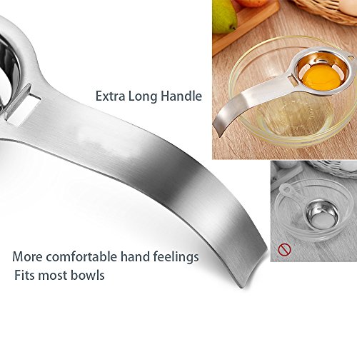 FITS MOST -- With a longer handle,this egg yolk separator can fits different size bowls/cups/containers and fits nicely on a bowl with a hook for sturdiness.