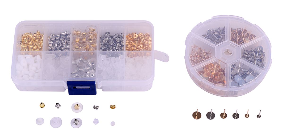 ・ピアス パーツ ポストピアス とキャッチの大量セットです。セット内容:ポストピアス×300個(シルバー4mm、5mm、8mm×各50個、ゴールド4mm、5mm、8mm×各50個、ケース×1個)、ピアスキャッチ×450個(ホワイト×30個、花形×100個、普通×100個、円盤型プラ、金、銀×各20個、蝶型金、銀×各50個、弾丸型金、銀×各30個、ケース×1個)