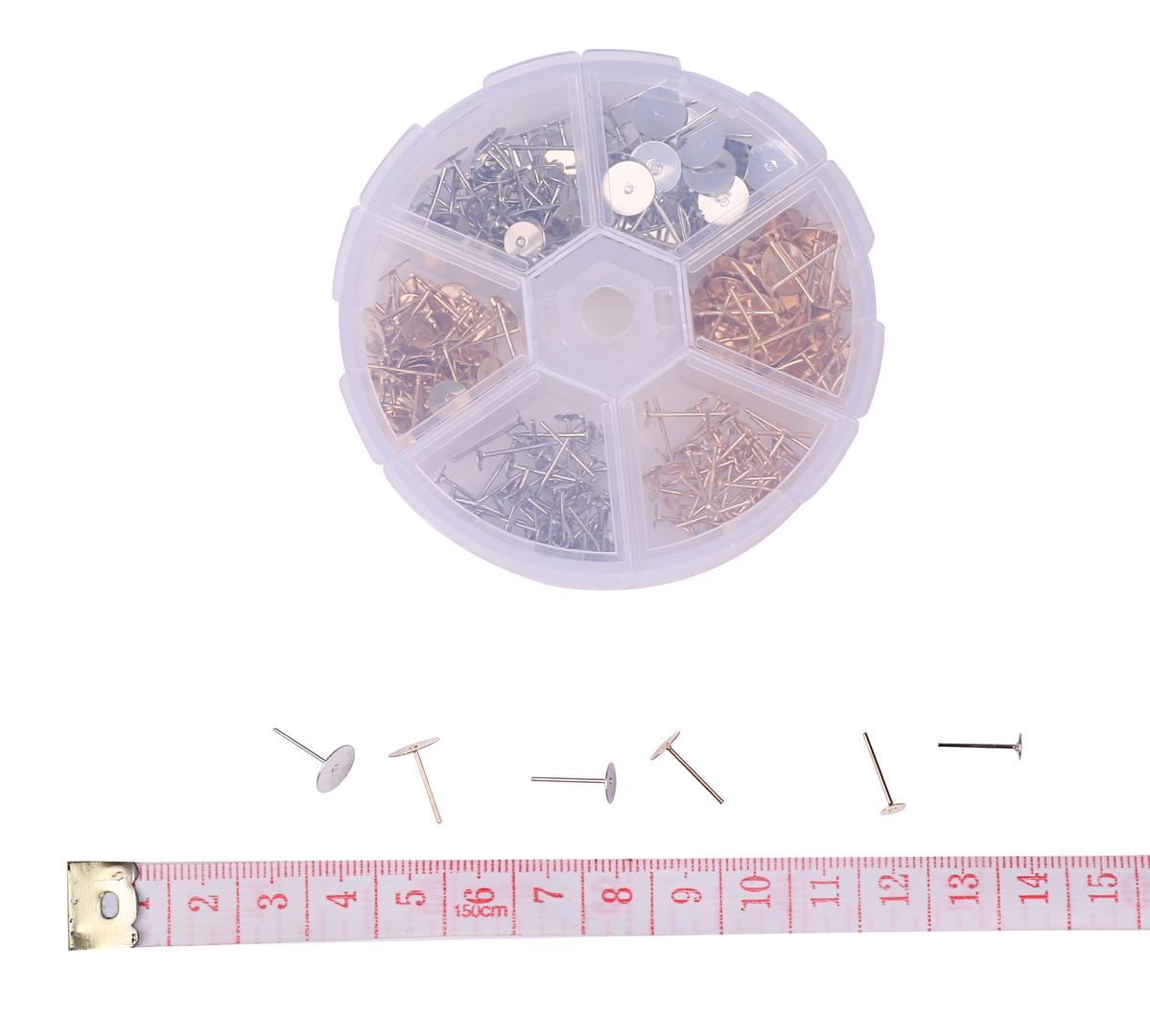 ・サイズ:ポストピアス/丸皿直径約4、6、8mm、長さ12mm、ピン直径0.7mm、ポストピアスケース/直径80mm、高さ20mm、キャッチ/ホワイト5×7mm 普通タイプ4×4mm 円盤プラ6×11mm 金、銀色円盤7×11mm 蝶バネ型 4×5mm 花形4×4mm 弾丸型5×6mm キャッチセットケース/128×65×22mm