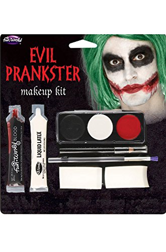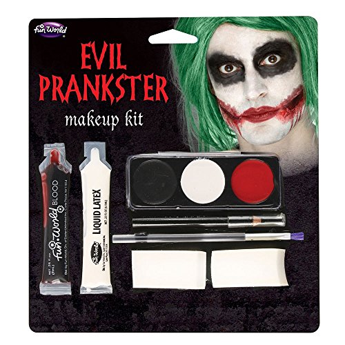 Product Description Re-create Joker's look with this Evil Prankster Makeup Kit. Includes (3) color makeup tray, blood, liquid latex, pencil, (2) sponges and brush. 0