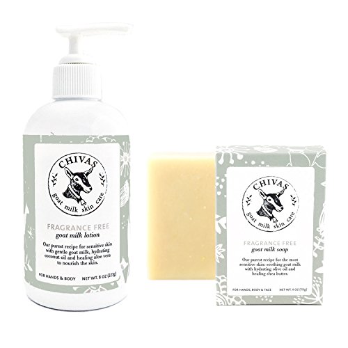 - Chivas Goat Milk Skin Care two-item gift set that includes one 8-ounce Hand & Body Lotion in "Fragrance Free" formula and one 4-ounce Market Soap in "Fragrance Free" formula.