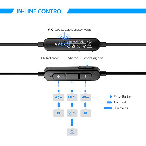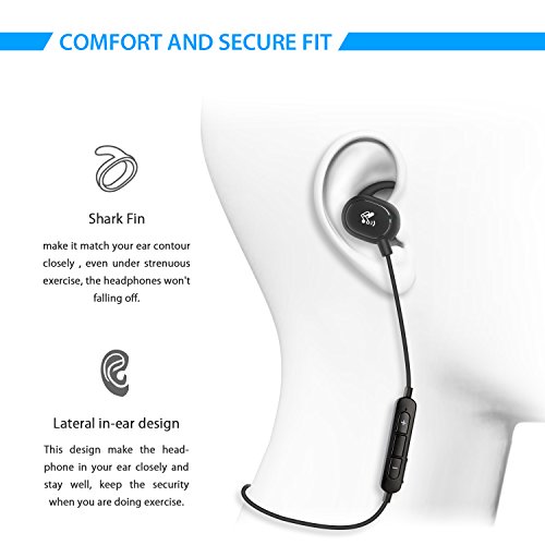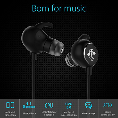 Feature : [Bluetooth 4.1 aptX]: Supports two connected devices simultaneously and allows to automatically connecting after paired successfully for the first time, high-fidelity stereo sound quality with aptX codec. The Headphones are compatible with most cell phones, iPhone and Android. / [Lightweight Design and Perfect for Sports]: It has a super Light Weight Design, the net weight is only 0.45 ounces, due to it??s light weight and compact, it??s perfect for sports without breakdown the tone quality, you will feel nothing for gym and your ear won??t hurt even after long time wearing. / [Comfortable and Curve Secure Design]: These Noise Canceling Earbuds include 3 pairs S/M/L Sport ear tips, 2 pairs S/M/L music ear tips and 3 pairs shark fin ear hooks to ensure a comfortable and secure fit for everyone. With specially designed ear hooks, you will never worry about the ear buds falling off in a gym or workout again. / [Sweat Resistant]: Built for your active lifestyle, the earbuds are rated IPX Level 4 and can withstand dripping sweat. Ergonomic design optimized for ultimate wearing comfort to match your active lifestyle like running, jogging, cycling, driving, camping, hiking gym exercise and other outdoor sports. / [Convenience]: Up to 6 hours play time / music time, with 180 hours standby time, this Bluetooth Earphones allow auto switching between music and calls. You can control all functions of music and calls easily via the buttons of Bluetooth headset. Built-in microphone enables taking hands-free calls while listening to music.