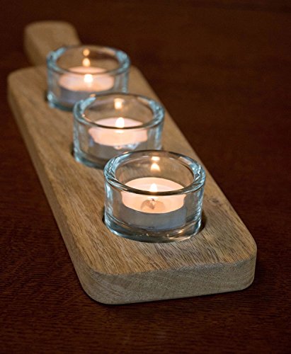 Premium Mango Wood and Glass Tea Light 3 Candle Holder with Handle