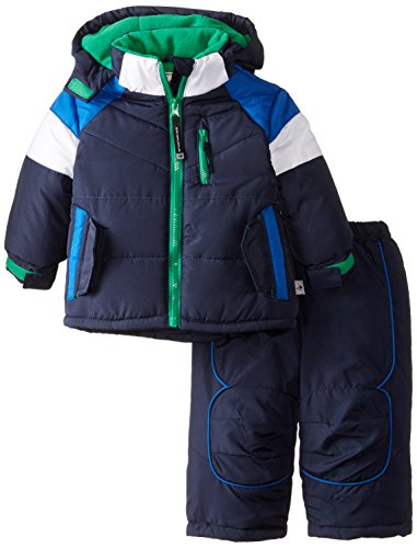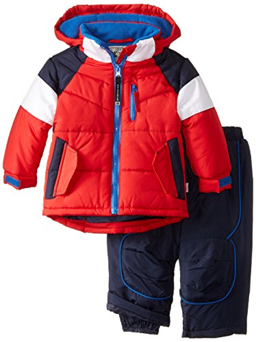 Two-piece snowsuit in bold colors featuring hooded quilted-puffer coat and snow pant