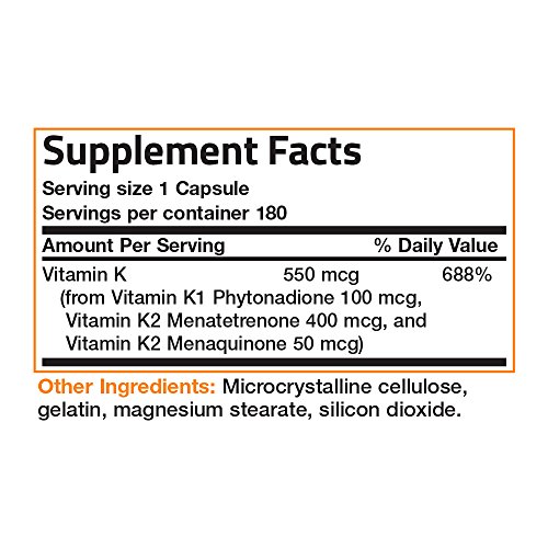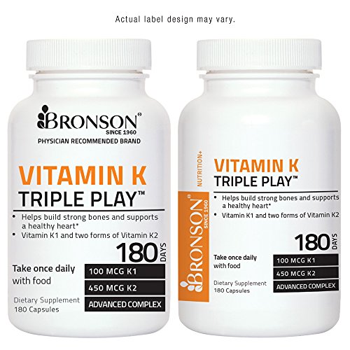 -. Binding : Health and Beauty -. Brand : Bronson Vitamins -. EAN : 0716563760007 -. Feature : FULL SPECTRUM COMPLEX: Provides both Vitamin K1 and two forms of Vitamin K2 Menatetrenone-4 (MK-4) and Menaquinone-7 (MK-7) / HIGHEST QUALITY FORMULA: Best ingredients available. Made in USA at FDA cGMP Registered Facility. / HIGHLY REGARDED AND RECOGNIZED: Our Products Have Been Consistently Recommended By The Foremost Nutritional Scientists Like Nobel Prize Winner, Dr. Linus Pauling / BRAND YOU CAN TRUST: Since 1960, Bronson has been providing families with the highest quality products and finest customer service available. This 50+ year heritage speaks for itself. / WORKS OR YOUR MONEY BACK: We back our products up with a 365-day hassle-free money back guarantee. There's no risk when you order now! -. IsAdultProduct : 0 -. Label : Bronson Laboratories -. Manufacturer : Bronson Laboratories -. MPN : 760A -. PackageQuantity : 1 -. PartNumber : 760A -. ProductGroup : Health and Beauty -. ProductTypeName : HEALTH_PERSONAL_CARE -. Publisher : Bronson Laboratories -. Size : 180 Capsules -. Studio : Bronson Laboratories -. Title : Vitamin K Triple Play 550mcg (Vitamin K1 100 mcg, Vitamin K2 450 mcg) 180 Capsules by Bronson Labs -. UPC : 716563760007