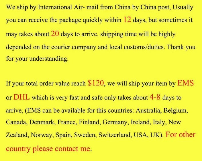 Countries of Canada, Australia, Holland, Peru etc. will not update the transit info by local POST OFFICE if choosing the shipping method of China Post Registered Air Mail, means the delivery time is not sure and can’t be checked before arriving local office, so please be careful consideration or contact with our customer service before pushing the BUY NOW button. Thanks for your great understanding.