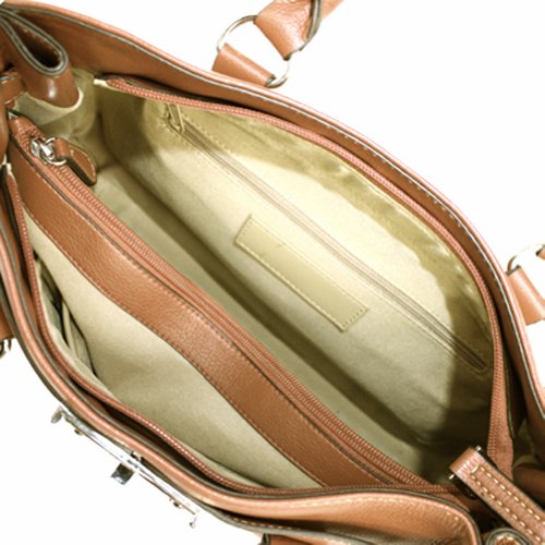 Made from vegan leather with silver-tone hardware. Back zip wall pocket. Dual carrying handles and zip top closure. Spacious fully lined double compartment separated by a zip top pocket. Interior zip wall pocket, cell and sun-glass slip pouches. Handle drop: 8". Body of bag: 15" L x 11" H x 3.5" W. BEFORE PURCHASING, PLEASE COMPARE THE SIZE OF THIS HANDBAG TO ONE OF YOUR OWN FAVORITE BAGS.Feature