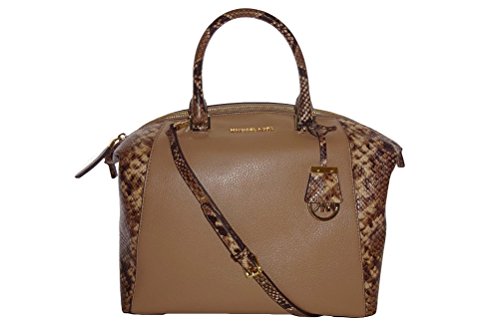 -. Brand : Michael Kors -. Color : Dark Khaki Python -. Department : womens -. EAN : 0889154507104 -. Feature : Leather Top zip closure Exterior: 1 back snap pocket Interior: 1 center zip compartment, 3 open pockets, 1 zip pocket, 1 cell phone pocket, 1 key fob Double top handles; adjustable / removable strap 18K gold-plated hardware and handing logo medallion MK monogram lining Dust & MK care card included. App. measurements: 11" (H) x 16.5" (W) x 6" (D) -. ProductGroup : Shoes -. ProductTypeName : HANDBAG -. Title : Michael Kors Riley Large Satchel Dark Khaki Python Leather Bag -. UPC : 889154507104