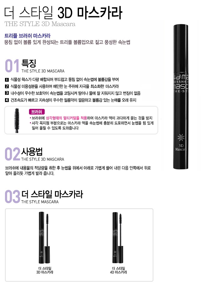 かたまりなくボリュームたっぷりのまつ毛に仕上げる3Dマスカラ! 植物性美容成分を使用し、敏感な目元にマイルドに! 乾燥速度が速く、優れた持続性で魅力的な目元を維持させます。 【使用方法】 ブラシに適当量を取り、まつ毛に軽く塗り伸ばします。 【商品構成】 ザスタイル3Dマスカラ1本