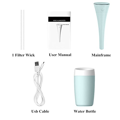 oulin's PORTABLE MINI HUMIDIFIER:It comes complete with matching water cup for added stability and keeps water clean from dust and lint.You can also take out and insert the main part into any glass or bottle. 12 hours Auto shut off and automatic shut-off when no water, compatible with any micro-usb cable, compatible with any water bottle.