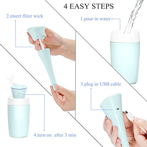 EASY TO USE: You just fill up the cup with water, after the internal filter was soaked, plug the device into your USB port and press the on/off button.one click can obtain pure and fresh and moist air, cool lamp working status, let you clearly know its working condition.