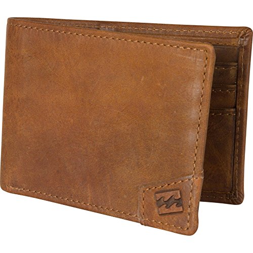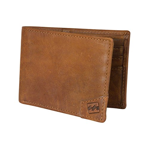 Bi-fold premium leather wallet with emboss wave logo on outside and billabong font emboss inside