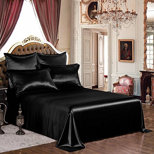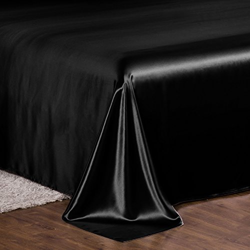 THXSILK 19mm Mulberry Silk King Flat Sheet Seamless with Fine Embroidery - Black