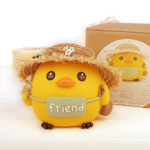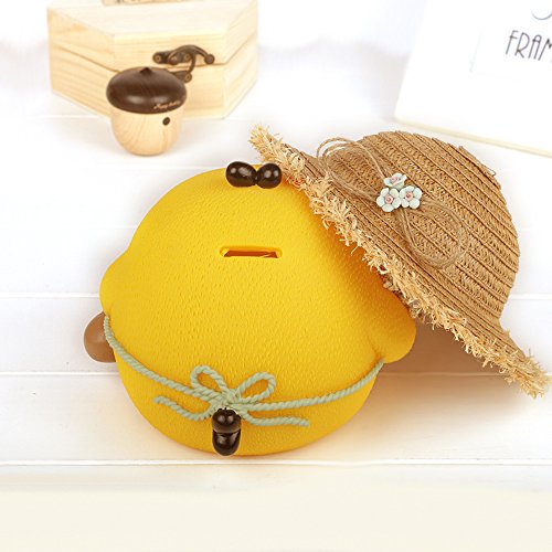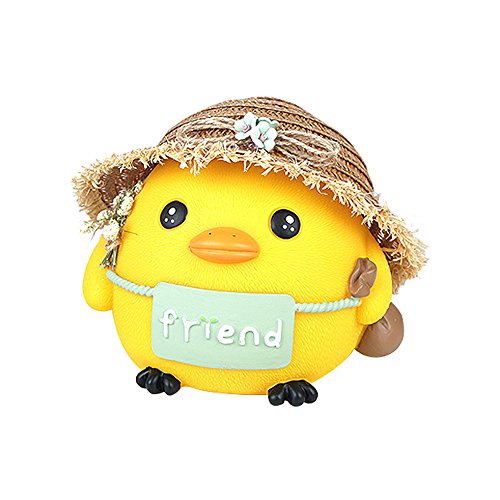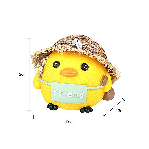 Description Size: 5" x 5" x 4.7" (13x13x12cm). Accepts virtually all coins. Material: Vinyl, durable and won't break. Rest assured that kids use. Design: the coin slot is under the straw hat, stopper on bottom for easy money removing. Cultivate children's financial management, develop a good habit leading to wealth. The perfect piggy bank for kids, adults will even love it. This cute chick sitting on shelf, brighten up any room.