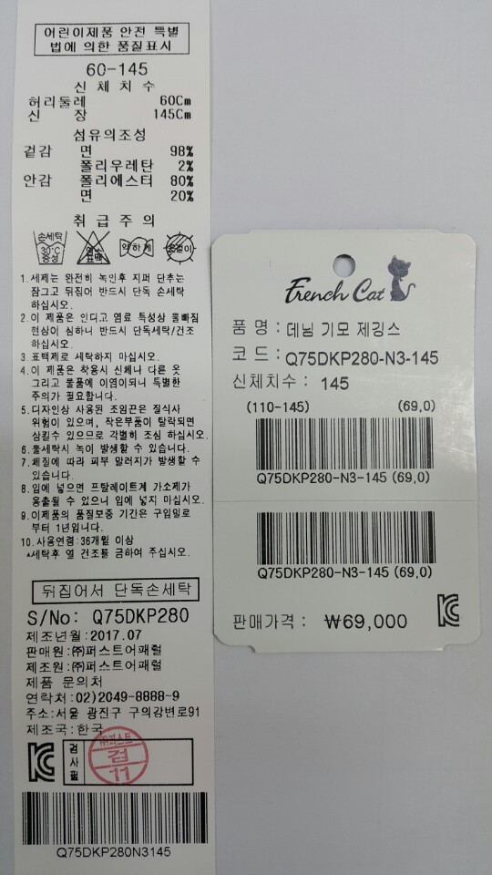 제품소재 : 겉감 면98% 폴리우레탄2%안감 폴리에스텨80% 면20%