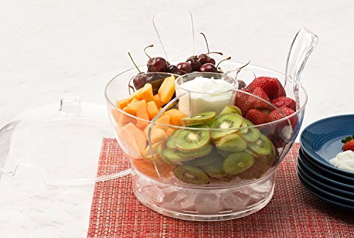 Enjoy your party without needing to fuss about your food, with the Professional Party Ice-Chilled Serving Bowl with Dome Lid and Serving Utensils by Perlli. Keeps your appetizers, fresh fruits & veggies, cold noodle dishes, and more chilled and tasty. Easy to use, spacious lid also protects against bugs and pests. Makes parties easier and more fun! How does the Professional Party Ice-Chilled Serving Bowl with Dome Lid and Serving Utensils by Perlli work? Ice goes in the ice container, then place the serving bowl on top - add the 4 x appetizer divider if you have several foods to keep cool. A typical fill will maintain foods chilled and fresh for 6+ hours. Clever vents in the serving bowl keep cool air flowing around your food, without touching the ice or melt water - your appetizers, salads and tasty party dishes stay fresh without getting soggy! The entire party serving set is made from non-toxic and BPA-free acrylic, strong and able to withstand heavy use and transport to and from events. Superb Party Serving Convenience Features Perlli's Professional Party Ice-Chilled Serving Bowl with Dome Lid and Serving Utensils is helpfully designed with several convenience features, including: -4 x appetizer serving sections, or one large serving bowl -Dishwasher safe in top rack -Secure lid -Heavy duty design -Utensils attach to serving bowl Contemporary styling and sharp looks are suitable for any occasion. This appetizers-on-ice party serving bowl also makes a wonderful gift for housewarmings, new couples, birthdays & anniversaries, and more. Or just treat yourself to your new favorite party serving item! A-to-z Guarantee & Free 2-Day Shipping Your purchase is protected by Amazon's A-to-z Guarantee, click now to enjoy ultimate convenience with this perfect party serving bowl with ice container that keeps your food cool and sanitary. Amazon Prime members receive 2-day shipping ABSOLUTELY FREE!Feature