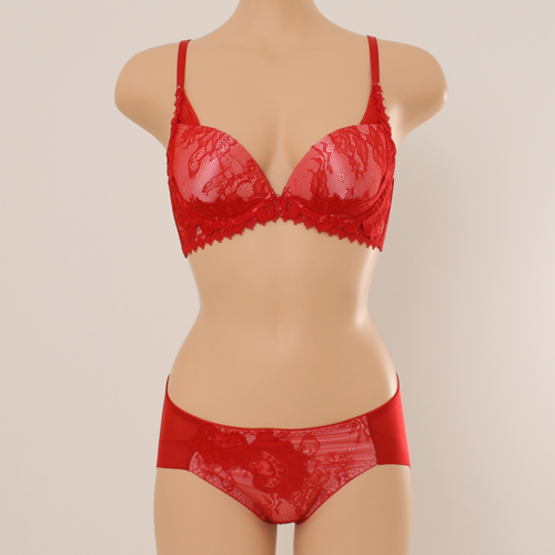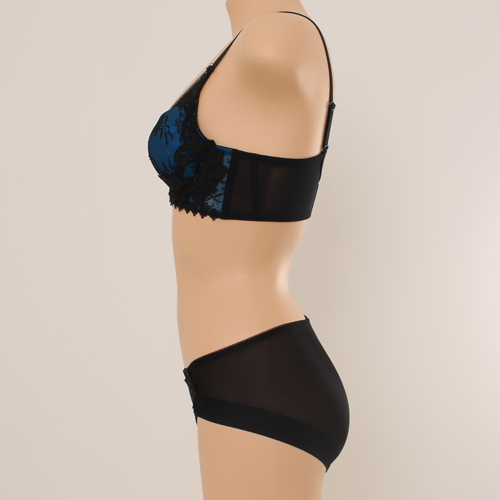 올오버 레이스와 원단 자수 모티브를 매칭하여 럭셔리 한 감각을 강조한 저중심 몰드브라입니다.