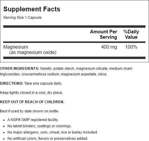 Magnesium is an essential mineral for calcium and potassium assimilation, and helps support proper nerve muscle impulses, enzyme reactions, formation of bone and carbohydrate metabolism. Magnesium Caps provide a natural, magnesium supplement with 400 mg, or 100% of the daily value, of magnesium.Feature