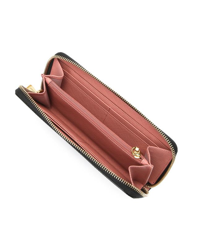 심플한 디자인에 로고 장식으로 포인트를 주었으며 내부를 핑크 컬러로 배색하여 여성스러운 느낌을 살린 장지갑입니다.