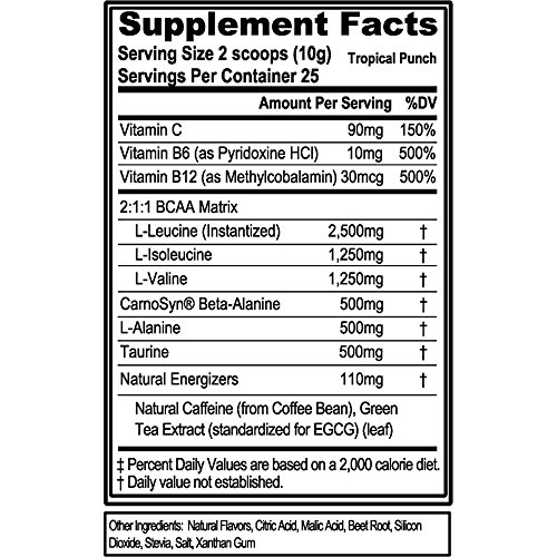 Ultrapremium BCAAS in proven 2:1:1 Ratio: L-LEUCINE Helps supply energy to muscles and support muscle protein synthesis.* L-ISOLEUCINE Supports muscle tissue development, recovery and lean body mass.* L-VALINE Plays a key role in supplying energy to muscles.* Recovery Energy and Endurance Boosters*: Beta Alanine Supports the buffering of lactic acid* L-ALANINE Supports glucose production for usable energy, endurance and recovery* TAURINE Supports cell hydration, metabolism and mental focus in combination with caffeine* VITAMIN B&C COMPLEX Vitamin B6 and B12 help support energy levels through intense workouts plus Vitamin C's powerful antioxidant helps support against stress and support healthy immune system.* Natural Energizers: Green Coffee and Green Tea Natural Caffeine sources for cleaner energy and antioxidantsFeature