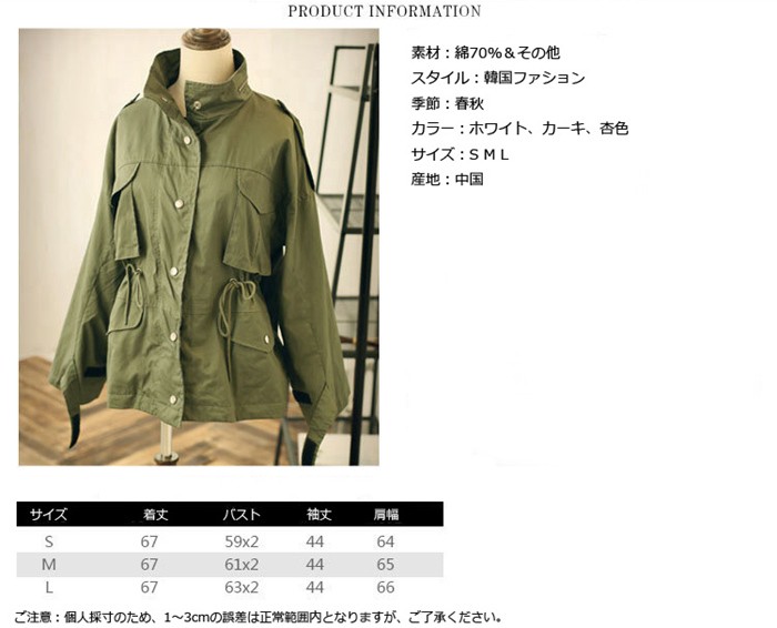 プリングコート レディース トレンチコート ライトアウター 大きいサイズ 春アウター ショート丈 高品質 (送料無料特価販売中) スプリングコート レディース キルティングコート 大きめ商品詳細素材:綿70%&その他スタイル:韓国ファション季節:春秋カラー:ホワイト、カーキ、杏色サイズ:S M L産地:中国サイズ参照表S 着丈67cm バスト118cm 袖丈44cm 肩幅64cmM 着丈67cm バスト122cm 袖丈44cm 肩幅65cmL 着丈67cm バスト126cm 袖丈44cm 肩幅66cmご注意:個人採寸のため、1~3cmの誤差は正常範囲内となりますが、ご了承ください。プリングコート レディース トレンチコート ライトアウター 大きいサイズ 春アウター ロング丈 ミディアム 高品質 (送料無料特価販売中) スプリングコート レディース キルティングコート 大きめ