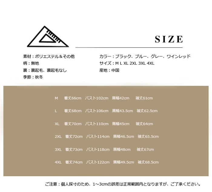 ブルゾンジャケット メンズ 裏起毛 大きいサイズ アウター コート 無地 ma-1ジャケット メンズ ゆったり ストレッチトップス フライトジャケット 2018新作登場 2017新作登場 ブルゾン 大きいサイズ メンズ 春アウター ジャケット メンズ商品詳細素材:ポリエステル&その他柄:無地裏:裏起毛、裏起毛なし季節:秋冬カラー:ブラック、ブルー、グレー、ワインレッドサイズ:M L XL 2XL 3XL 4XL産地:中国サイズ参照表M 着丈66cm バスト102cm 肩幅42cm 袖丈61cmL 着丈68cm バスト106cm 肩幅43.5cm 袖丈62.5cmXL 着丈70cm バスト110cm 肩幅45cm 袖丈64cm 2XL 着丈72cm バスト114cm 肩幅46.5cm 袖丈65.5cm3XL 着丈73cm バスト118cm 肩幅48cm 袖丈67cm4XL 着丈74cm バスト122cm 肩幅49.5cm 袖丈68.5cmご注意:個人採寸のため、1~3cmの誤差は正常範囲内となりますが、ご了承ください。ブルゾンジャケット メンズ 裏起毛 大きいサイズ アウター コート 無地 ma-1ジャケット メンズ ゆったり ストレッチトップス フライトジャケット ブルゾン 大きいサイズ メンズ 春アウター ジャケット メンズ