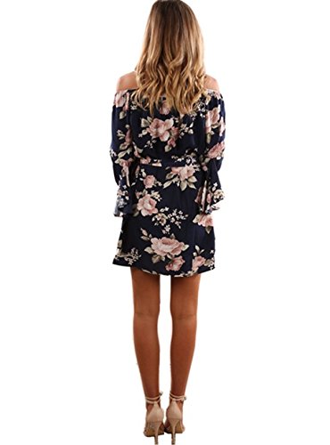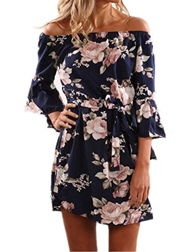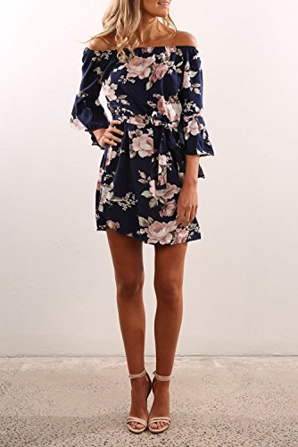 Features: Vintage Floral Print/ Sexy Off Shoulder Strapless/ Slash Neck/ Flare Sleeve/ Lace Up Wasit/ Above Knee Short Dress