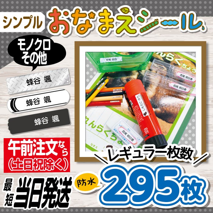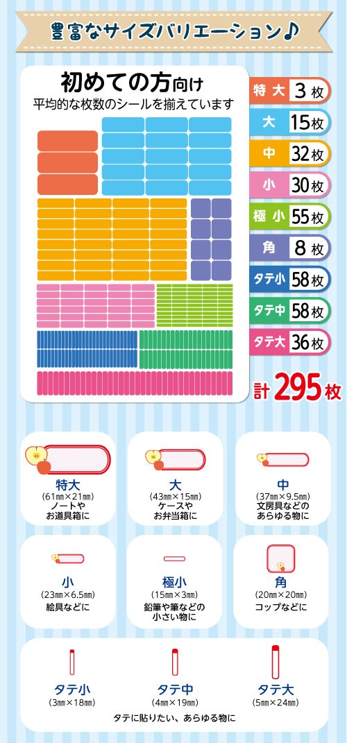 | 入園準備・入学準備の際の大変なお名前付けをラクにしてくれる「お名前シール」♪ こちらは初めての方向けの295枚が、A4サイズ1枚に印刷されています。 もちろん、カットライン入りではがしやすい★ 防水シート&ラミネート加工で、食器類に貼っても安心。 電子レンジ・食洗器にも対応しています。 お名前は、ひらがな・カタカナ・ローマ字・漢字をご利用いただけます。(混在もOK) ※名前シールを旧字体で制作ご希望のお客様は、ご注文時に「ストアへの連絡事項」にご記入ください。 可能な限りご対応させて頂きます(ご対応できない場合もございます) <内容> 特大 61mm×21mm *3枚 大 43mm×15mm *15枚 中 37mm×9.5mm *32枚 小 23mm×6.5mm *30枚 極小 15mm×3mm *55枚 角 20mm×20mm *8枚 タテ小 3mm×18mm *58枚 タテ中 4mm×19mm *58枚 タテ大 5mm×24mm *36枚 合計295枚 <素材> 防水タック紙(表面PPラミネート加工) |