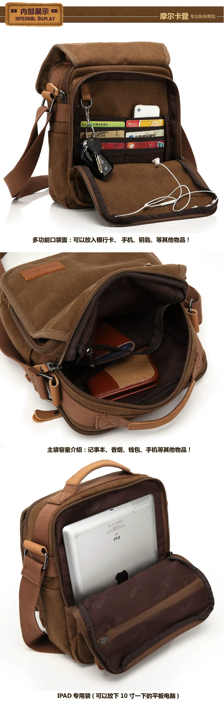 个性独特的帆布休闲男包单肩斜跨IPAD包,外观时尚简洁 是内部功能强大,日常出行要带的东西都能装下:可以放【 钱包、手机、日记本、名片夹、眼镜、IPAD】等更多东西。 【Moore Carden/摩尔卡登】品牌男包的水洗帆布精美 的衬托出复古气质,做工精湛,材质优良。成功路上的好伙 伴,会伴你一直闪耀到最后!