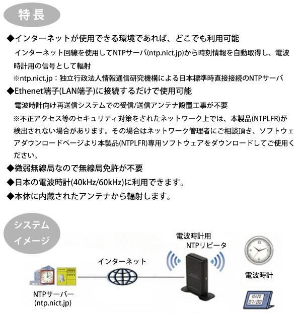 | 仕様 | 出力周波数:40/60kHz(スイッチ切替) 入力端子:Ethernet(RJ-45) 電源電圧:DC12V 同期精度:10ms(0.01秒)以下 消費電力:4.5W以下(付属ACアダプター使用時) 輻射可能範囲:半径10m |