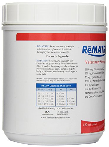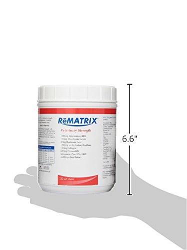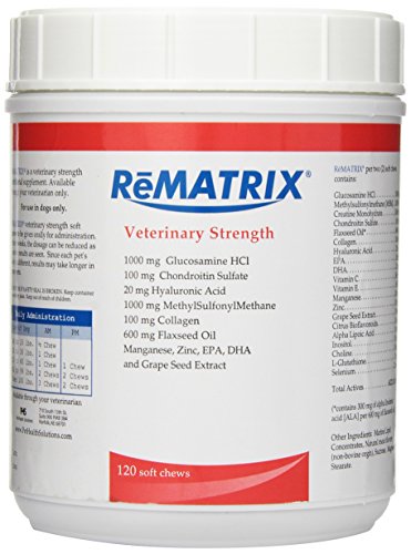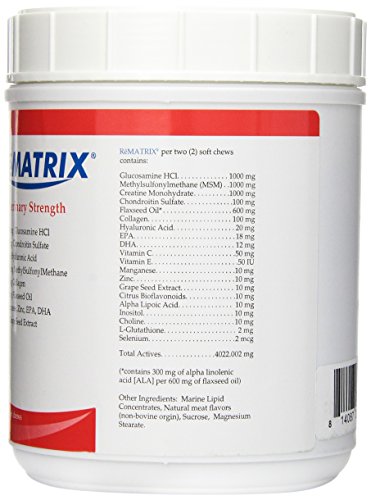 -. Feature : ReMATRIX Soft Chews is a veterinary strength nutritional supplement. / This supplement is perfect in providing your dogs a complete dose of nutrition in their diet. / Contain abundant nutrients: Glucosamine HCI, MSM, Creatine Monohydrate, Chondroitin Sulfate, Flaxseed Oil, Hyaluronic Acid, Vitamins and more. / Per 2 soft chews contains more than 4 grams (4,022 mg) of active ingredients. / Great for pets with joint health conditions!