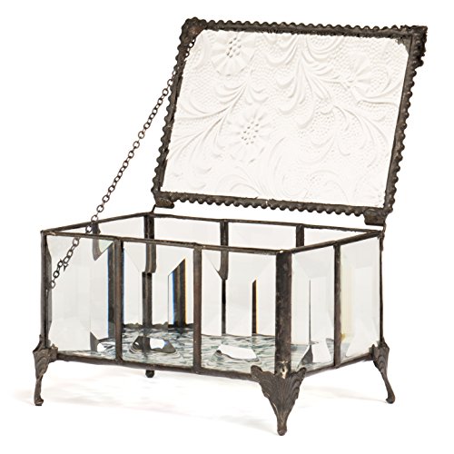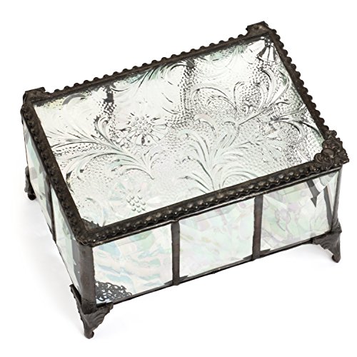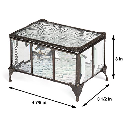 -. Feature : Sides of this keepsake box are made with multiple pieces of beveled glass and the hinged top features clear glass embossed with an autumn floral texture, bottom has iridescent glass / Decorative beaded edge, filigree corner handle, sculpted metal feet, chain on the inside to support the top when it is open / Use this glass box to display your jewelry, trinkets and keepsakes / Handcrafted stained glass jewelry box made with lead free solder to protect you and the environment / Designed and Manufactured by J Devlin Glass Art 4 7/8" x 3 1/2" x 3"