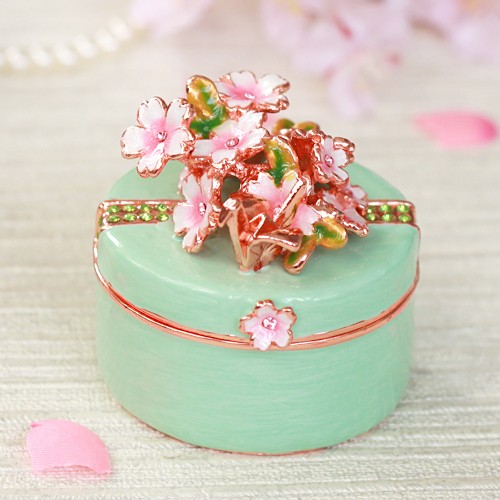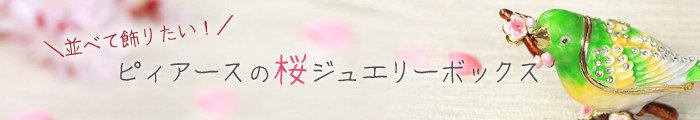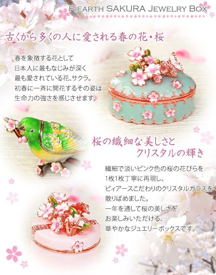 | ジュエリーボックスと言えば、指輪やピアス、ネックレスなどのアクセサリーを入れる引き出し型のケースを思い浮かべる方が多いかもしれません。 ピィアースのジュエリーボックスは、動物や花などをモチーフに作られ、合金製でずっしりとした重さがあります。また高品質のクリスタルガラスを贅沢に使用。まるでジュエリーボックスそのものが宝石のような、高級感溢れる仕上がりです。 小物入れとしても使えるように開閉口には磁石が取り付けてあり、アクセサリーなどなくしやすいアイテムの収納ができます。キラキラと美しく輝く宝石箱は、そのまま飾って楽しめるインテリア雑貨として多くの方に愛されています。 国内トップクラスのジュエリーボックスメーカーであるピィアースは、2004年ごろから本格的に宝石箱の製造を始め、現在のジュエリーボックスはなんと300種類以上。大規模展示会でもご好評いただいており、全国有名百貨店でも販売されています。 自社工場でひとつひとつ丁寧に手作りし、原型作成、研磨、加工、着色、小さなクリスタルガラスの取り付けなども全て手作業で行われるこだわりのハンドメイド品。完成後は厳しい検品の後、丁寧に梱包作業をしお客様にお届けしております。 ピィアース商品は、全国有名百貨店および全国有名宝石店チェーンにてお取り扱いいただいている高品質商品です。 ★自分へのご褒美に…コレクションして並べて飾ると、さらにかわいらしさUP! ★恋人へのプレゼント…中にアクセサリーを入れて、サプライズな贈り物として ★家族への感謝ギフト…お母さんや姉妹へ、日頃のありがとうの気持ちを込めて ★誕生日プレゼント…お友達の喜ぶ顔が見たいから、いつもと違うキラキラギフトを ★小さな女の子へ…まるでお姫様が使っているようなキラキラ宝石箱は女の子の憧れ! |