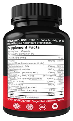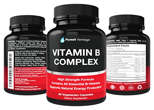 -. Feature : SIMPLY THE BEST: Want the best Vitamin B complex on the market? Then look no further. We have combined all the essential B Vitamins to provide a high potency formula in just one capsule. We also include Inositol and Choline, two relatives of the Vitamin B family that can aid with memory, motivation, focus, and overall cognition. / MORE VALUE: B-Vitamins are water-soluble and not easily stored in the body, thus requiring frequent replenishment. Our 90 capsule bottle gives you an entire 3 months of unbeatable quality and value, more than other competitors. Did we mention, it's also GMO free and vegan safe with no gluten, soy, wheat, sugar, binders, fillers or additives? / HIGHEST QUALITY INGREDIENTS - We carefully select each individual ingredient for maximum health benefit and highest quality. All of our Purest Vantage products are made here in the USA in an FDA inspected facility following strict GMP guidelines. We are confident you will love our Vitamin B supplement. Order with confidence knowing that we've got you covered. / VITAMIN B BENEFITS - I'm sure you've heard people recommend B Vitamins for their various benefits. They help your body's ability to get or make energy from the food you eat. They also help form red blood cells. Studies have shown B Vitamin supplementation can help to counter symptoms of deficiency including fatigue, anemia, loss of appetite, anxiety, depression, abdominal pain, muscle cramps, hair loss, and eczema. / VITAMIN B BENEFITS - I'm sure you've heard people recommend B Vitamins for their various benefits. They help your body's ability to get or make energy from the food you eat. They also help form red blood cells. Studies have shown B Vitamin supplementation can help to counter symptoms of deficiency including fatigue, anemia, loss of appetite, anxiety, depression, abdominal pain, muscle cramps, hair loss, and eczema.