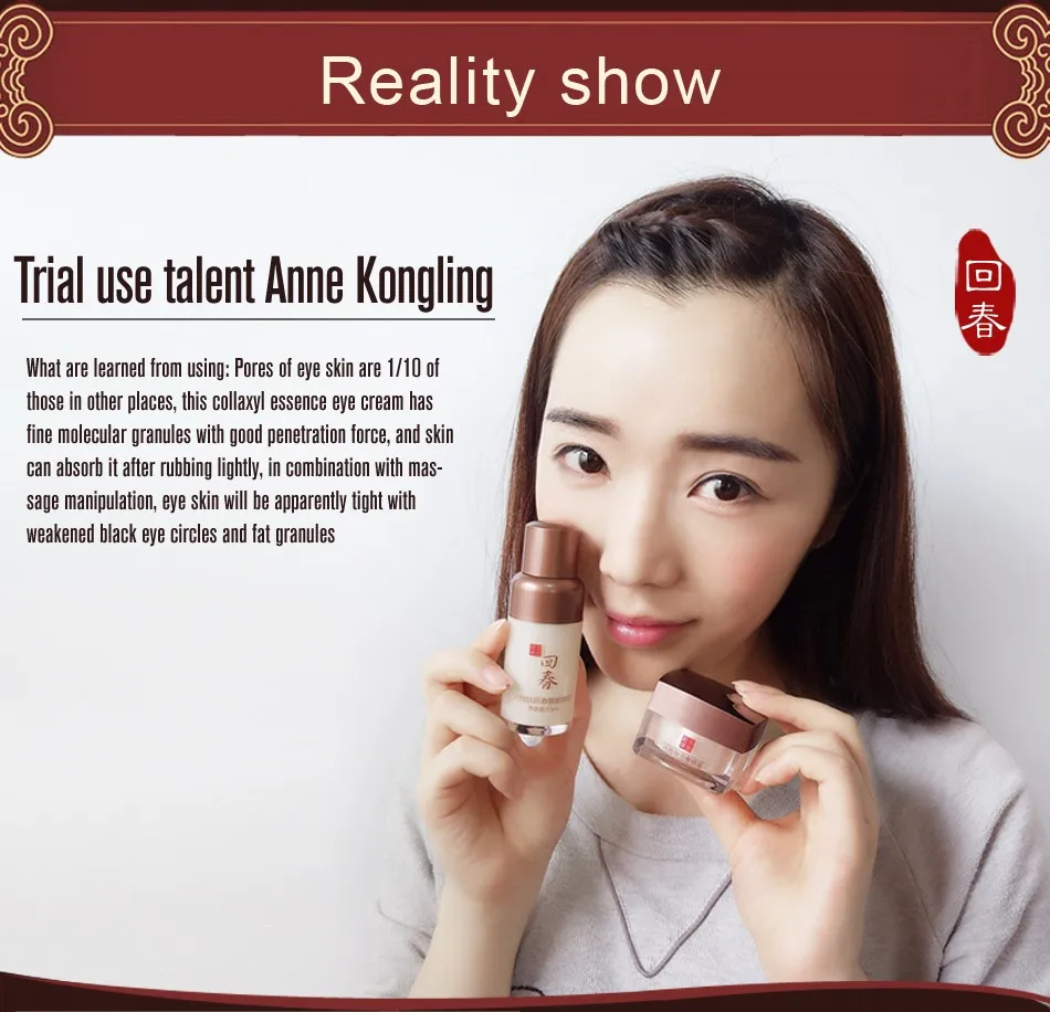 。セMajor effects。ソPrecious Chinese medicine essence are extracted and melted into each drop of eye essence」ャ effectively promote synthesis of collagen protein and rebirth of eye skin」ャ weaken microgrooves and edema」ャ allow skin to hid signs of past times and re-pick elasticity and color.