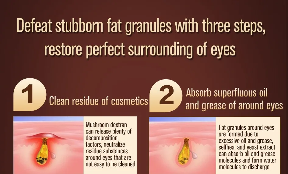 Fat granules around eyes are formed due to excessive oil and grease」ャselfheal and yeast extract can absorb oil and grease molecules and form water molecules to discharge.