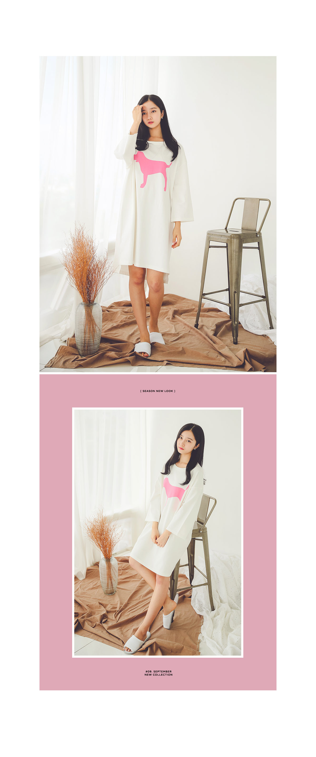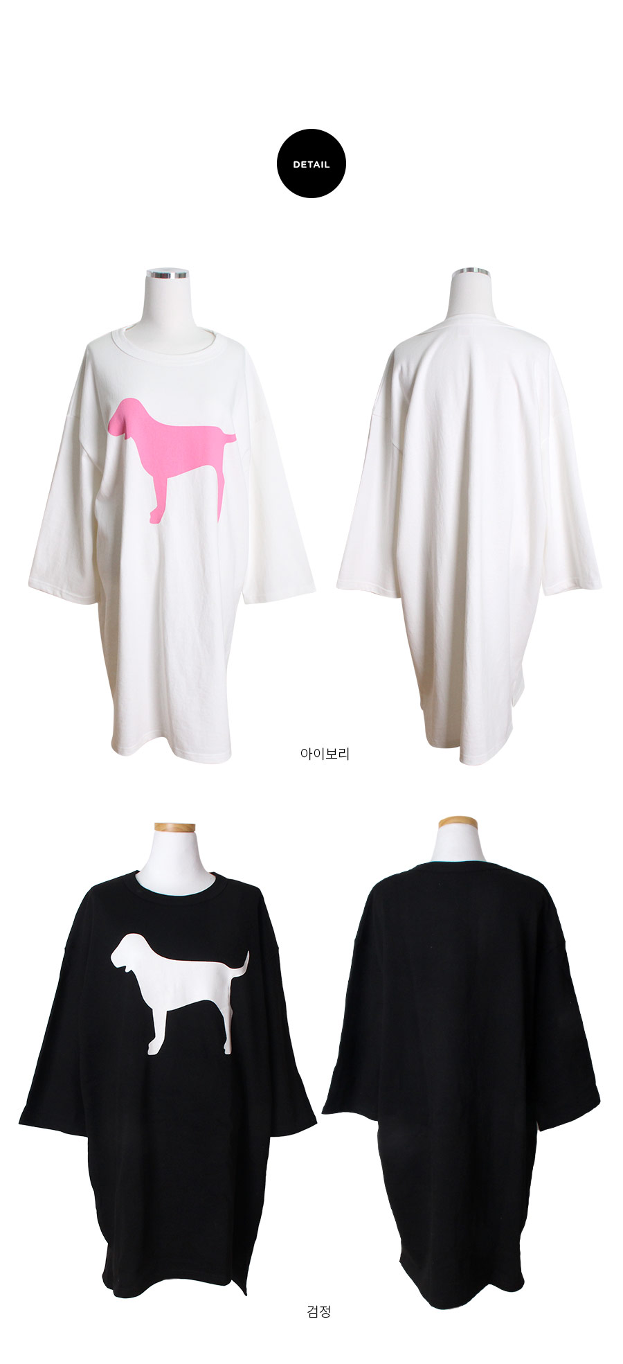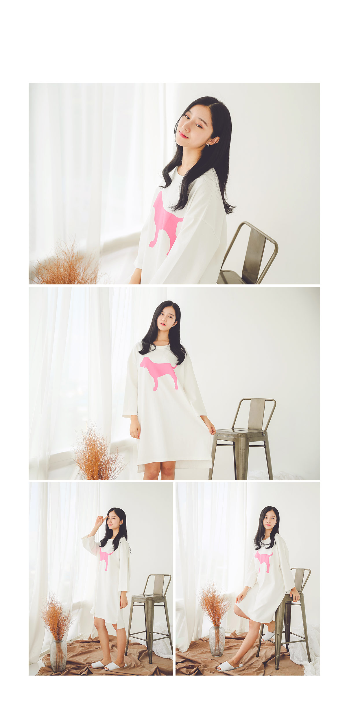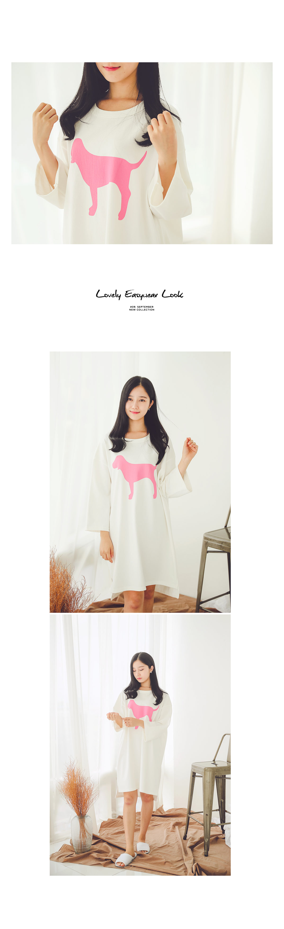 톡톡한 조직감으로 퀄리티가 높은 원단을 사용하여 오래 입으실 수 있도록 제작한 싱글 원피스에요 : ) 면 100%이지만 퀄리티 있는 홈웨어 면으로 탄탄하여 입었을 때, 흐늘거리지 않고, 만족스러운 핏감이 나오실거에요.^^ 네크라인을 예쁘게 내어주는 라운드 네크라인으로 편안함을 강조시켜주었고, 소매 부분은 A라인으로 살짝 퍼지듯이 떨어지는 라인으로 더욱 스타일리쉬 해 보입니다. 소매의 기장은 살짝 짧게 제작하여 포인트를 주었어요. 원피스의 하단은 절개를 넣어주고 앞판보다 뒷판을 살짝 더 길게 내려주어 세심하게 디자인을 하였습니다. 가운데 커다란 강아지 페인팅으로 포인트를 주었습니다. 꼼꼼한 공정으로 봉제와 원단이 좋은 퀄리티 있는 이지웨어 겸 홈웨어입니다. 원단이 톡톡하여 화이트 컬러도 비침이 없이 입을 수 있습니다. 여행, MT , 수련회, 홈웨어 등등 어디에서나 두루두루 입으 실수 있는 편안한 룸웨어입니다.^^ 컬러는 깔끔한 화이트, 블랙으로 구성하였습니다 컬러감은 다 무난하여 취향에 맞게 입으시기 좋습니다.^^