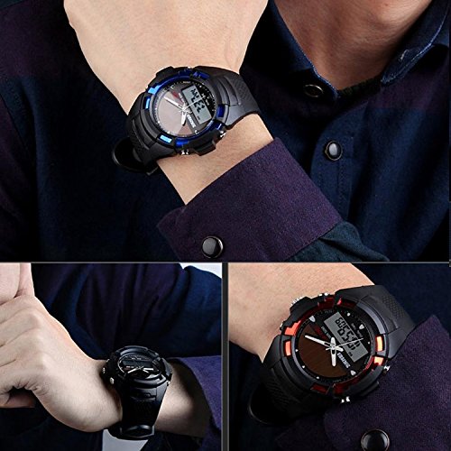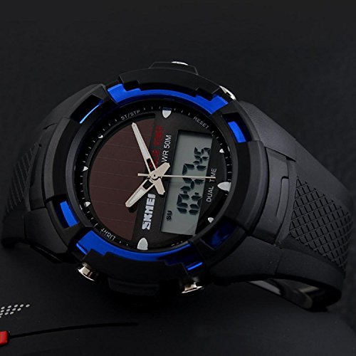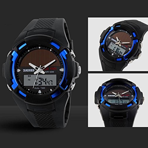 -. Feature : Solar power, long endurance battery / Brand new and fashionable outlook dual time zones display / Multifunction: Time, Calendar, Alarm, Stopwatch, LED backlight / Soft black rubber band, comfortable to wear / 30m water resistant, suitable in daily and sports life