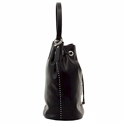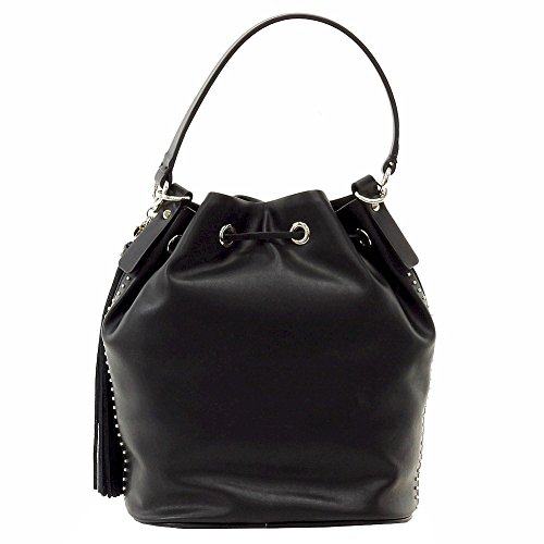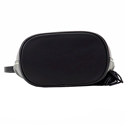 -. Feature : Faux-leather exterior. Pale gold-tone hardware. / Front triangle patch with logo emblem and stud detail. Removable faux-suede tassel detail. Drawstring closure. / Interior features zipper wall pocket and three multipurpose pockets / Single top handle with 7" drop. Removable, adjustable cross-body strap with 21.5" drop. / Quattro G logo-print lining