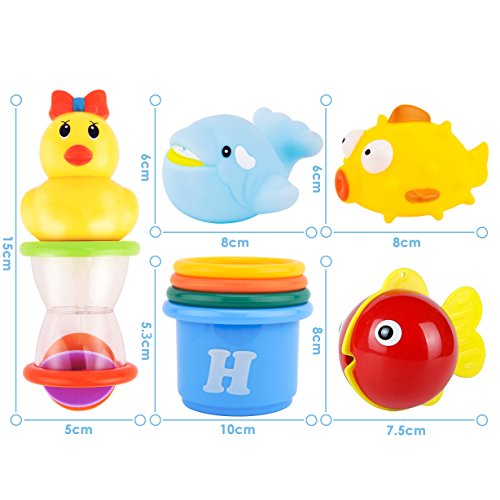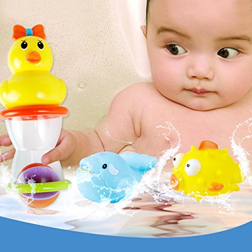 [MUCH FUN FOR BATH TIME]This is a nice little bath toy set that has everything your child needs. The duck and fish are very cute, plus the stacking cups, kids can play with different toys and not get bored in bath anymore. And your little babies will have much fun to watch the water go through the toys holes. These adorable kid friendly games toys will definitely win your little ones' heart. Turn bath time into so much fun.